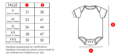 Talle: Desde talle P (hasta 3 meses) al talle XXG (hasta 18/24 meses)